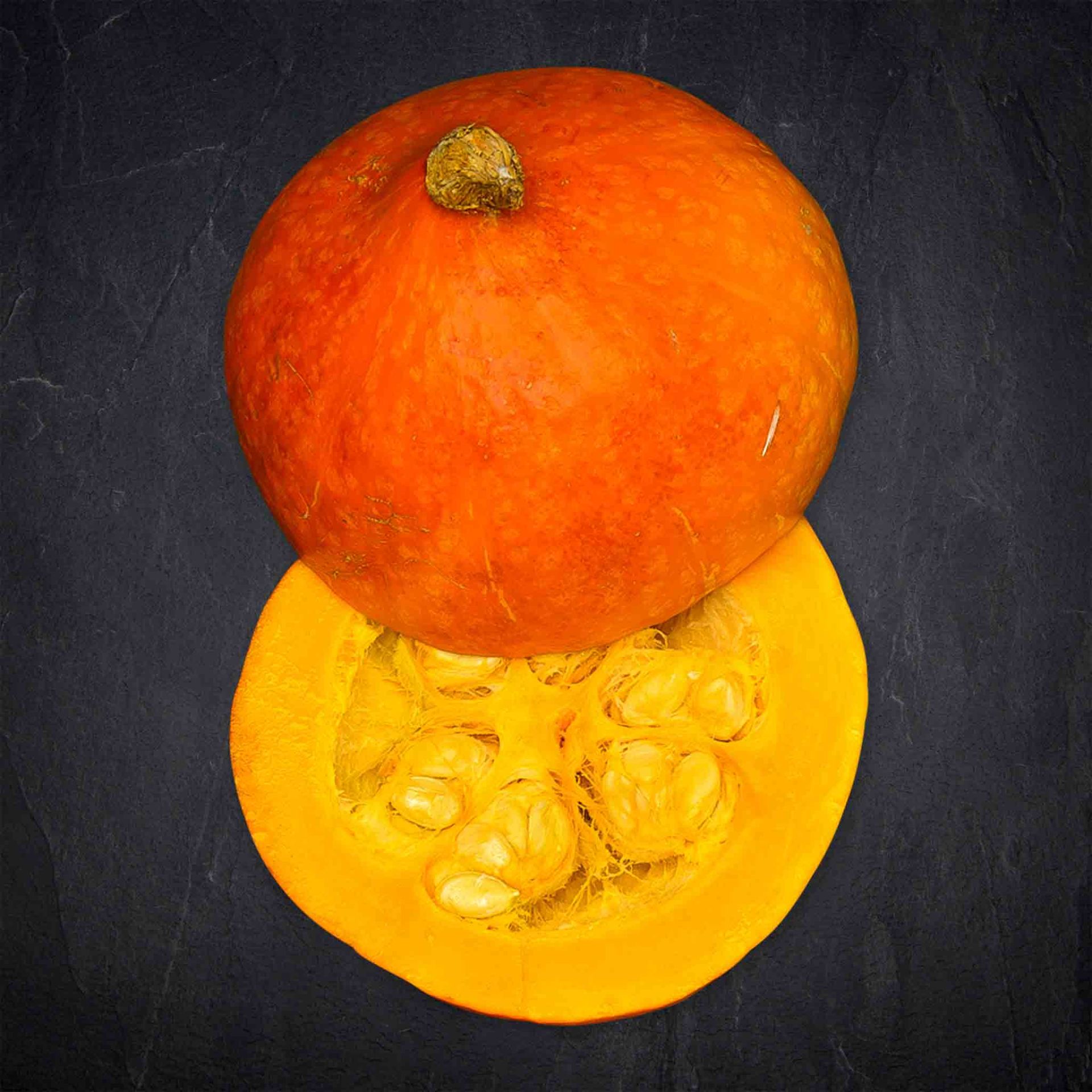 - Kürbis waschen, halbieren, Kerne entfernen und würfeln.