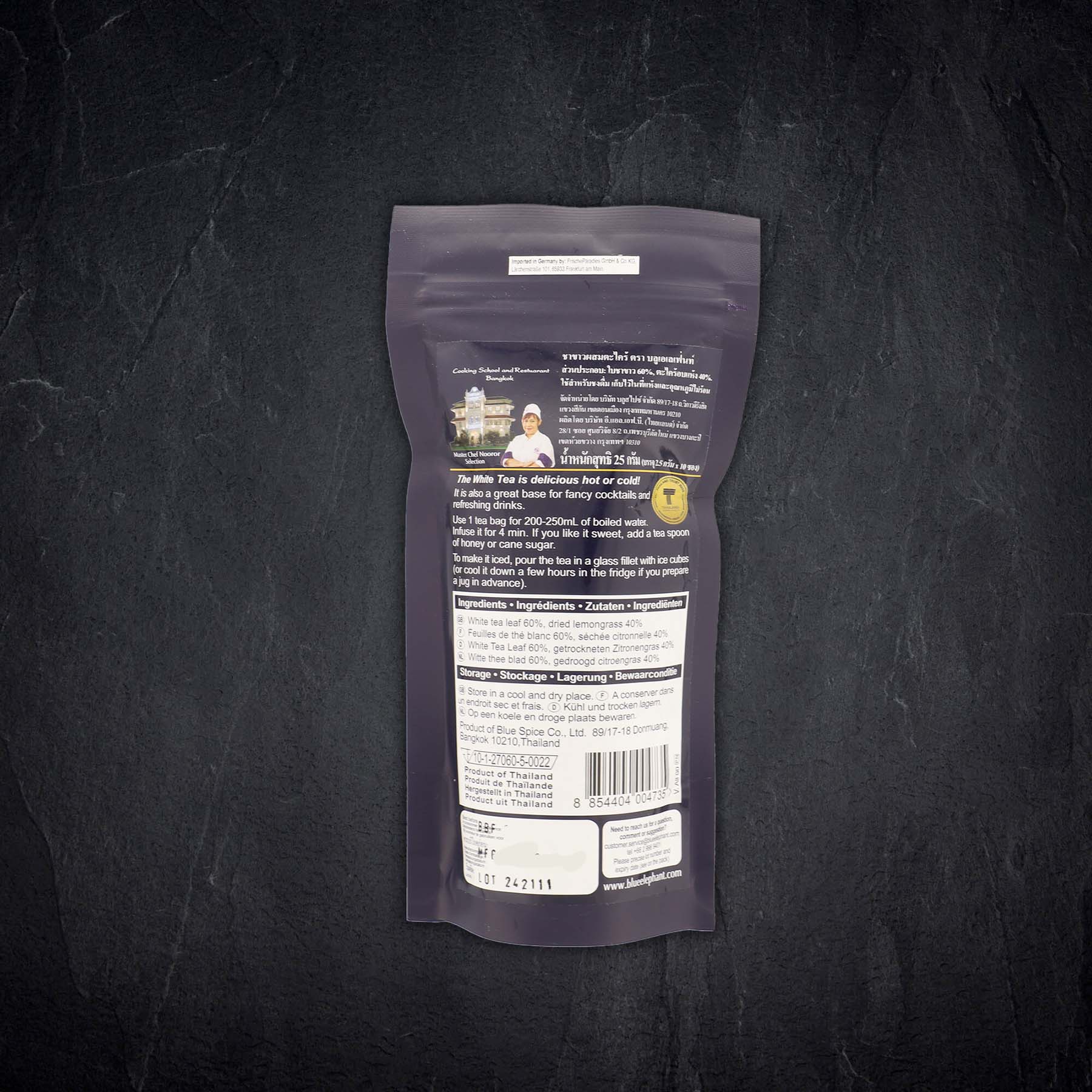Dieser weiße Tee mit Zitronengras von Blue Elephant überzeugt mit einem frischen Aroma. Er kann warm oder kalt genossen werden und macht sich auch in Cocktails besonders lecker.